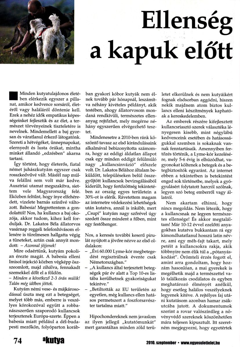 Mein Hund überstand die Krankheit, die die sich explosionsartig in ganz Europa ausbreitenden Zecken neben anderen, auch für Menschen gefährlichen Krankheitserregern verbreiten, mit einer Nieren- und Leberschädigung. Wegen der Babesiose leben beispielsweise die früher auf den Wiesen, an den Ufern im Süden von Budapest häufig anzutreffenden Streunhunde nicht länger als ein paar Monate, abgesehen von ein paar Ausnahmen, in deren Körpern, wie mein Tierarzt sagen würde, außerordentliche, natürliche Antikörper vorhanden sind, die einige, einfach durchzuführende Tests lohnen würden. Auf jeden Fall bestätigte sich mir bei den ersten Ausflügen im Frühjahr 2010, dass der bisherige leidige Zustand nur der Vorbote einer alles übertreffenden großen „Zeckeninvasion“ war. Aus der Untersuchung der von mir an Dr. Béla Lakatos gesendeten, in den Ortschaften gesammelten Zecken stellte sich heraus, dass in einzelnen Landesteilen schon 30 % mit Krankheitserregen infiziert sind. Ich machte mich daran, im Internet nach Schutzmöglichkeiten zu suchen, vor allem deshalb, weil mein Hund mit seinem dicken Fell wie eine Malerwalze alles im Gras auflas.