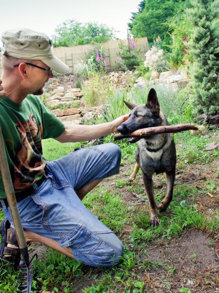 Der Hund lernte sehr viel. Er machte fast jede Minute eine neue Erfahrung. Nach paar stündiger gemeinsam durchgeführten Arbeit wusste sie schon, dass sie den arbeitenden Menschen ausweichen muss und nicht verkehrt. Sie passte schon auch auf die Bewegung der Gartenwerkzeuge in unseren Händen mit Vorsicht und mit entsprechendem Respekt auf und akzeptierte, wenn sie nicht vorsichtig um den Spaten und um unseren Beinen rumläuft, kann sie für die erlittenen Schmerzchen nur sich selbst verantwortlich machen. Man könnte sagen, in paar Stunden wurde das „verwöhnte Fräulein“ zu einem „Soldat“. Selbstverständlich war ihre Hilfe für unsere Gartenbauarbeit nicht zu nützlich, da sie die mulmigen Äste und Erde nicht unseren Plänen entsprechend platzierte, aber das war von ihr gar nicht erwartet. Am Nachmittag griff sie nicht einmal nach lebendigen Gewächsen und fühlte sich selbst als nützlicher Mitglied unserer Brigade. Dafür konnten wir beobachten, an welchen wilden Grasarten im Garten sie gerne kaut und so pflanzte ich einige davon in den Schutz von Steinen, damit sie auch in „Notzeiten“ etwas zu kauen hat. Um die Konflikte zu vermeiden, schützte ich einige, wegen Hundepfoten gefährdeten Gartenteile mit Stangen und gespannten Gurten in der Höhe des Hundes. Ich beruhigte meinen Freund, ich werde Lisas Verhalten regelmäßig kontrollieren und sobald sie die geschützten Teile zu respektieren scheint, werden diese im Garten abgebaut.
