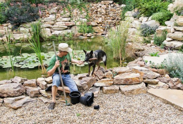 Die erste Aufgabe war zum Beispiel den Gartenteil rund um den Gartensee hundfreundlich zu machen, falls unser Lisa Hund trotz allem diese Richtung nähme. Hier änderte ich die Uferfelsen an einer ca. 2 Meter breiten, platten Strecke auf flache Steine und schrieb einen zusätzlichen Geotextil-Schutz zur Seefolie vor, der sogar bei den Hundekrallen einen Riss in der Folie verhindert. An den anderen Uferstrecken zeichnete ich die Felsen und sonstige Gelendegegenstände so, dass diese die Bewegung des Hundes nicht ermöglichten, zumindest unbequem machten. Wassergewächs plante ich auch nur im Schutz der Uferfelsen einzupflanzen.