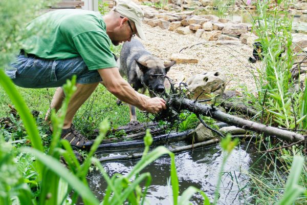 Zum Umpflanzen wählten wir ein kühles Wochenende im September. Ich bat meinen Freund, Lisa einige Tage lang auf Diät zu halten und sie ein Tag vor meinem Besuch möglicherweise gar nicht zu füttern. So als ich ankam, mit Taschen voller Belohnungshäppchen, war sie fast aus dem Häuschen. Ihr wurde es aber schnell klar, dass ihr Futter für den Tag völlig leistungsabhängig sein wird. Als erster Schritt gruben wir Lisas eigenen Regenfangsee aus, wobei sie beim Kommando „suche hier” mit mir gemeinsam graben musste. Da sie sich verweigerte, steckte ich Belohnungshäppchen für sie zwei Spaten tief in die Erde. So wurde der Graben schneller tiefer. Solange sie grub, harkte ich die ausgegrabene Erde, dann legte ich Seefolie in den Graben und füllte ich es zum Lisas größten Staunen mit Wasser auf. Beim Umpflanzen der Hecke lagerte ich die ausgegrabenen Gewächse vorläufig im Lisas See, bis die neue Stelle fertig war. Da bekam Lisa noch mehr Aufgaben. Sie musste graben und Stöcke, Wurzeln tragen. Verboten war es ihr aber, lebendige Baumäste zu berühren. Ich bewegte ihr nur mulmige Wurzeln und Stocke als Beute vor der Schnauze das Kommando „fass“ benutzend und verbat jeder Biss an einem lebendigen Gewächs. Sie durfte nur an den Stellen graben, wo ich es ihr erlaubte. Sie akzeptierte das, weil sie an diesen Stellen immer Leckerlies fand. Wir fanden inzwischen auch eine Maikäferlarve, mit der sie lange spielen konnte.