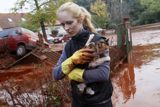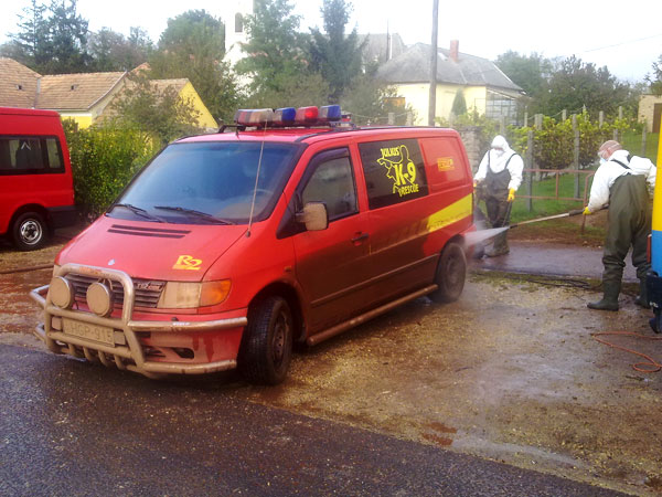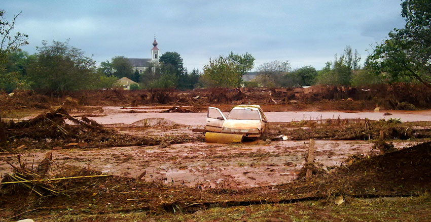 Dann kam der 4. Oktober 2010, ein Montag, und die Rettungsmannschaft musste umdenken. Diesmal wurden sie zu Hause in Ungarn gebraucht. Bei der Gemeinde Kolontár war ein Auffangbecken für den aus dem Tonerdewerk in Ajka stammenden roten Schlamm gebrochen. Der alkalische Todesschlamm überschwemmte die angrenzenden Dörfer und tauchte alles in rote Farbe. Vielen missglückte die Flucht vor dem starken Strom. Manche konnten sich auf Häuserdächer und umliegende Hügel retten. Die am Ort des Geschehens eintreffenden Dienste mussten in den ersten drei Stunden quasi hilflos die Zerstörungen betrachten. Das Ausmaß der Katastrophe konnte niemand einschätzen, doch erreichte der Alarm jede existierende Einheit, die für Rettungsmaßnahmen geeignet war.